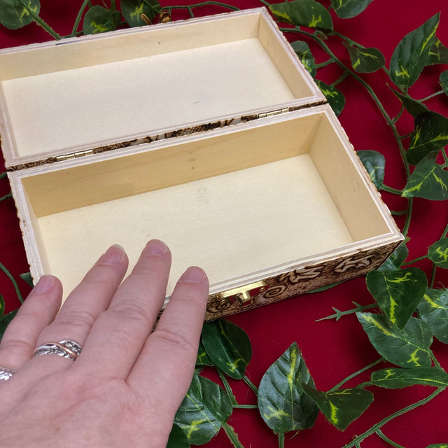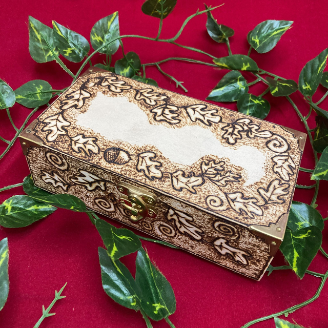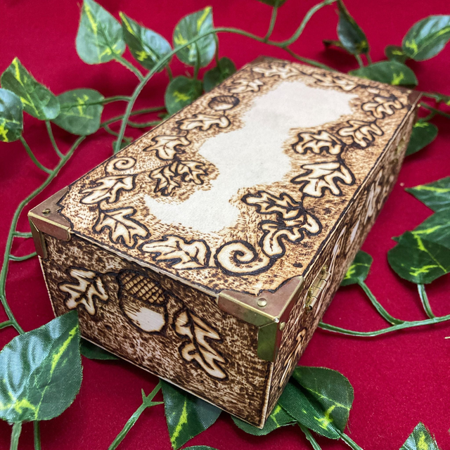 Tarot box, heavily decorated and hand pyrographed with oak leaves and acorns. Interior dimensions: 16.5cm x 8cm x 6cm approx.
