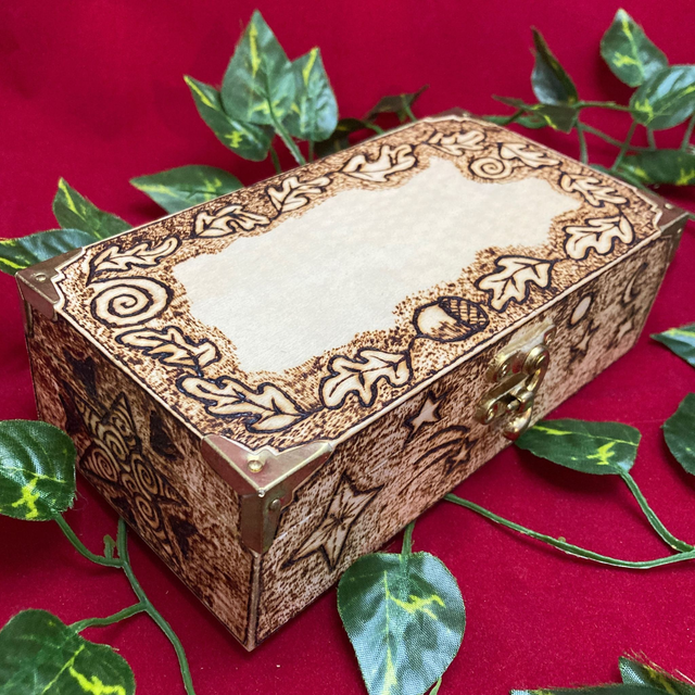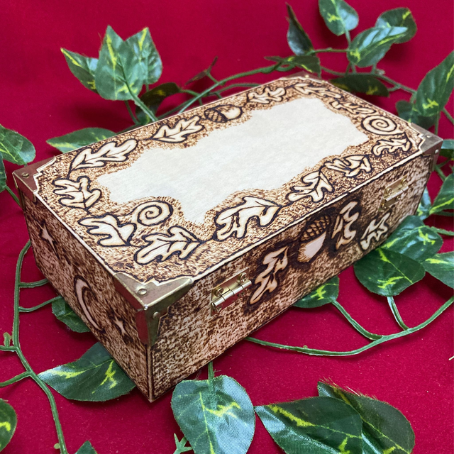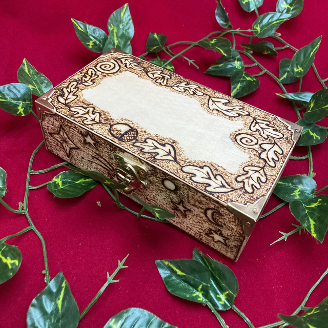 Tarot box, heavily decorated and hand pyrographed with oak leaves and acorns on the top and celestial designs around the sides. Interior dimensions: 16.5cm x 8cm x 6cm approx.
