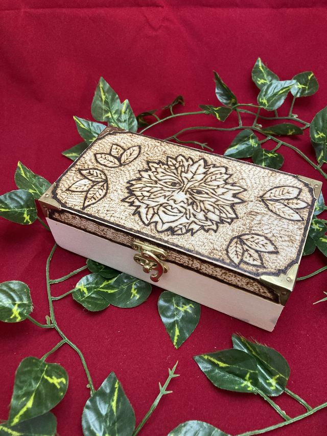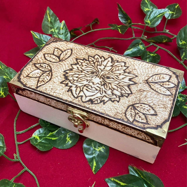 Tarot box, heavily decorated and hand pyrographed with the Green Man and leaves. Interior dimensions: 16.5cm x 8cm x 6cm approx.