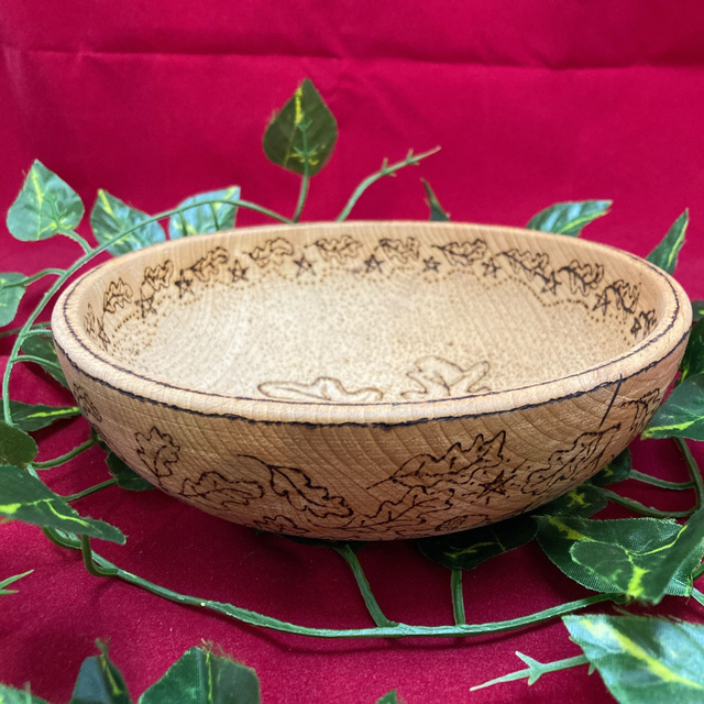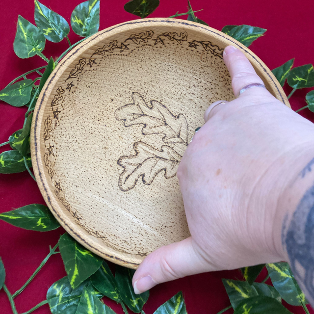 A turned wooden bowl, decorated inside and out with acorns and oak leaf themes, as well as pentacles and linework. I'm not sure what the wood on this one is, but it *looks* a lot like beech. No promises though!