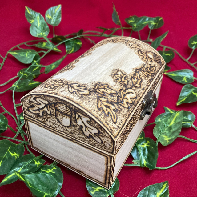 Tarot box, heavily decorated and hand pyrographed with oak leaves and acorns. Interior dimensions: 12cm x 8cm x 6cm approx.