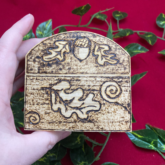 Tarot box, heavily decorated and hand pyrographed with oak leaves and acorns. Interior dimensions: 12cm x 8cm x 6cm approx.