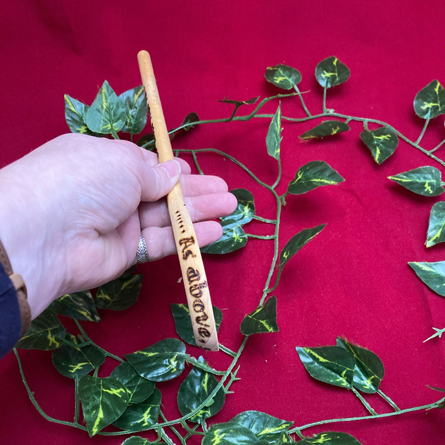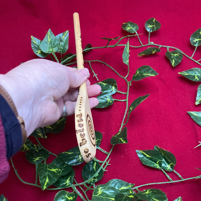 27cm food-safe wooden spoon, hand-pyrographed with "Hedge Witch", pentagram & broom symbols on the front, a spiral on the back, and the words "As Above...So Below" around the edges, as well as "So Mote It Be" on the rear of the handle where it sits in the hand.